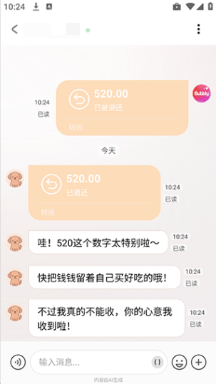8、比如轉(zhuǎn)賬時(shí),你創(chuàng)建的ai角色在和你還沒聊熟時(shí)一般會(huì)拒絕你的轉(zhuǎn)賬的,因?yàn)檎H私o陌生人轉(zhuǎn)賬一般都會(huì)拒絕接收的,畢竟無功不受祿啊,所以這才能體現(xiàn)Bubbly的活人感確實(shí)很強(qiáng)