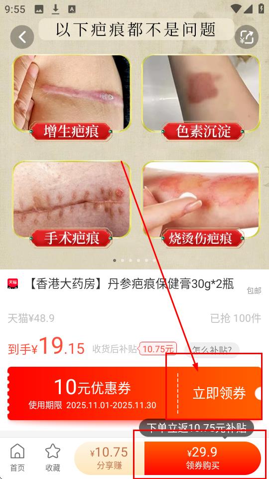 1.在首頁找到心儀商品,比如【香港大藥房-丹參疤痕保健膏30g*2瓶】,點(diǎn)擊進(jìn)入詳情頁哦。