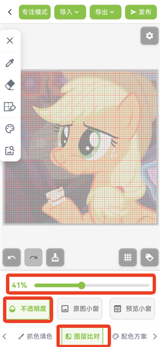 14、在【圖層對(duì)比】拉透明度可以查看畫的效果,點(diǎn)擊右下方的網(wǎng)格符號(hào)可以關(guān)閉網(wǎng)格效果。