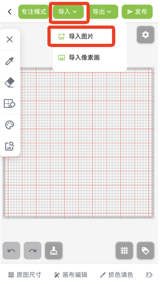 1、同樣的進(jìn)入到編輯頁面后,點(diǎn)擊上方的【導(dǎo)入】,選擇【導(dǎo)入像素畫】。