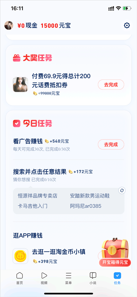 (2)通過(guò)大獎(jiǎng)任務(wù)、今日任務(wù)等方式可以獲取大量元寶