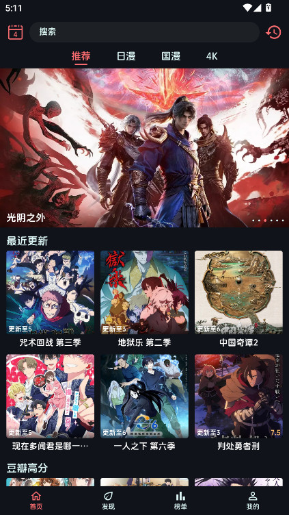 1.進(jìn)入首頁(yè)即可瀏覽最新更新的日漫、國(guó)漫、歐美動(dòng)畫(huà)等作品,熱門(mén)新番一目了然。