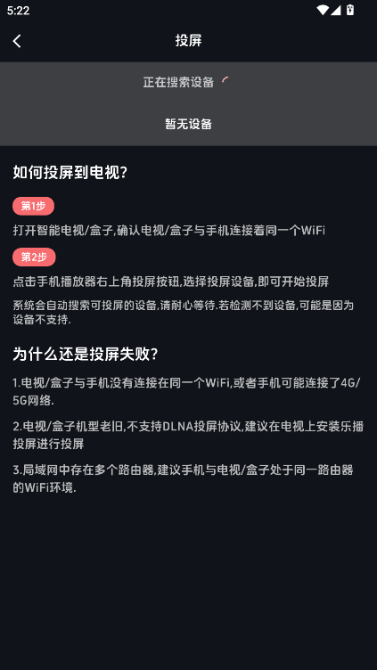 4.打開(kāi)智能電視/盒子,確認(rèn)電視/盒子與手機(jī)連接著同一個(gè)WiFi。選擇投屏設(shè)備,即可開(kāi)始投屏。(需要注意的是系統(tǒng)會(huì)自動(dòng)搜索可投屏的設(shè)備,請(qǐng)耐心等待)
