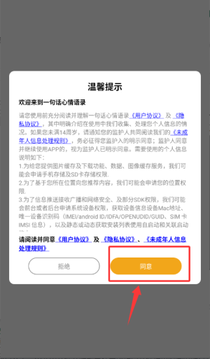 1.打開應用后在溫馨提示窗口內(nèi)點擊同意按鈕,確認相關協(xié)議條款。