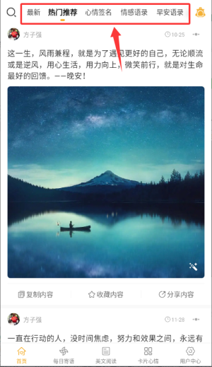 2.進入首頁可通過熱門推薦或心情簽名等分類,瀏覽對應語錄內(nèi)容。