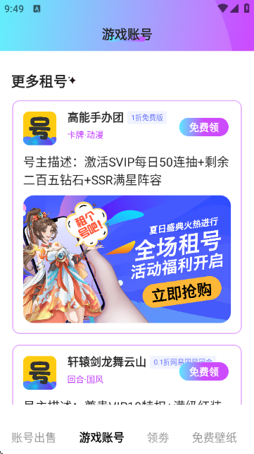 4.返回主界面,切換至“游戲賬號”頁面,可瀏覽推薦的租號活動,例如“高能手辦團”或“軒轅劍龍舞云山”的限時優(yōu)惠租號服務,并點擊“免費領”參與活動。