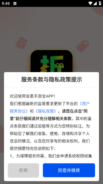 1.打開“省氪手游寶APP”后,首次進入會彈出《服務條款與隱私政策提示》窗口,用戶需閱讀并點擊“同意并繼續(xù)”以完成授權流程。