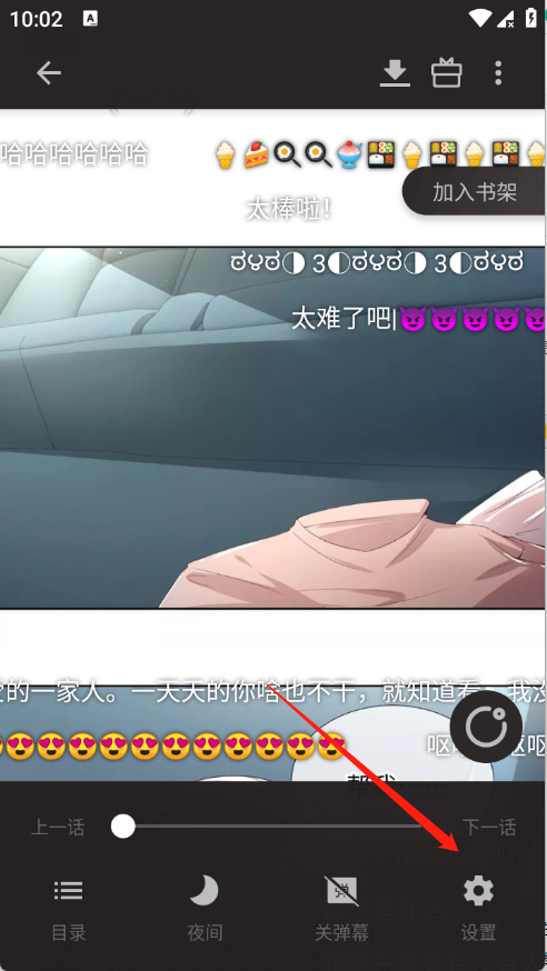1、點(diǎn)開(kāi)想看的漫畫(huà)進(jìn)入到閱讀頁(yè)面,點(diǎn)擊屏幕任意位置,點(diǎn)擊設(shè)置。