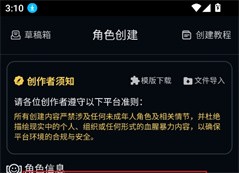 2.點(diǎn)擊“創(chuàng)作”按鈕進(jìn)入角色創(chuàng)建頁(yè)面,系統(tǒng)提示需遵守創(chuàng)作規(guī)范,確保角色設(shè)定符合平臺(tái)要求,并可選擇使用模板或?qū)胛募M(jìn)行快速創(chuàng)建。