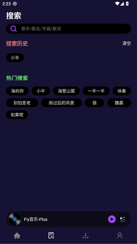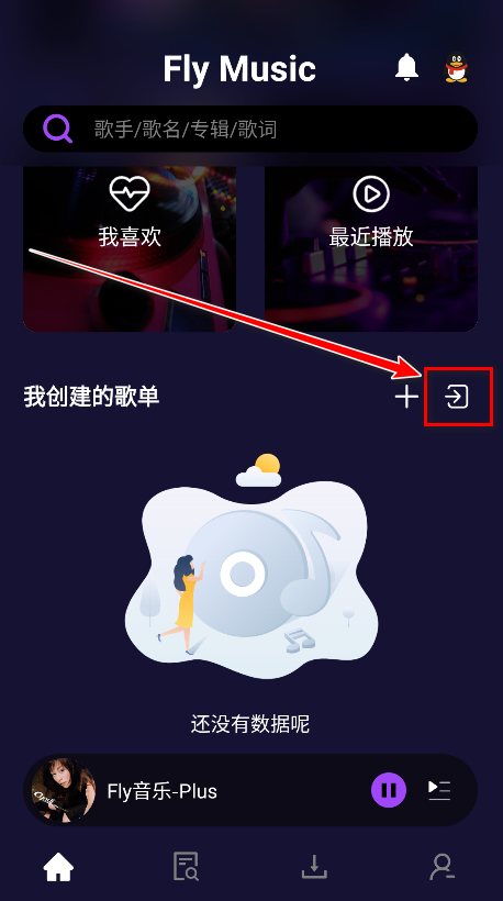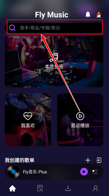 1.打開fly音樂plus,點擊首頁的搜索框。