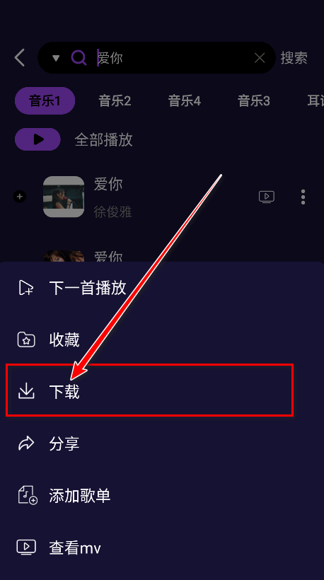 3.可以看到就會顯示支持下一首播放、收藏、下載、分享、添加歌單、查看mv等功能,想用哪個就直接點擊哪個就好。比如小編點擊下載。