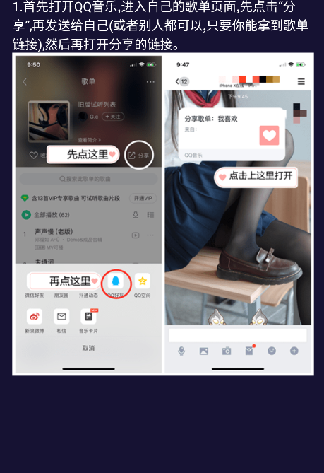 3.首先打開QQ音樂,進入自己的歌單頁面,先點擊“分享",再發(fā)送給自己(或者別人都可以,只要你能拿到歌單鏈接),然后再打開分享的鏈接。