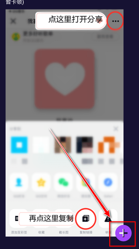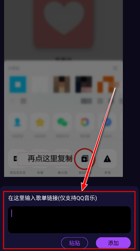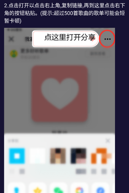 4.點擊打開以點擊右上角,復(fù)制鏈接,再到這里點擊右下角的按鈕粘貼。(提示:超過500首歌曲的歌單可能會短暫卡頓)