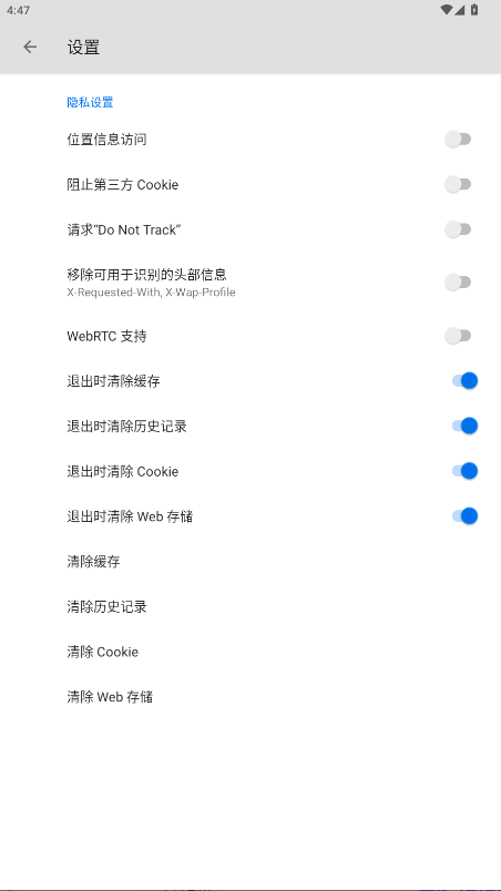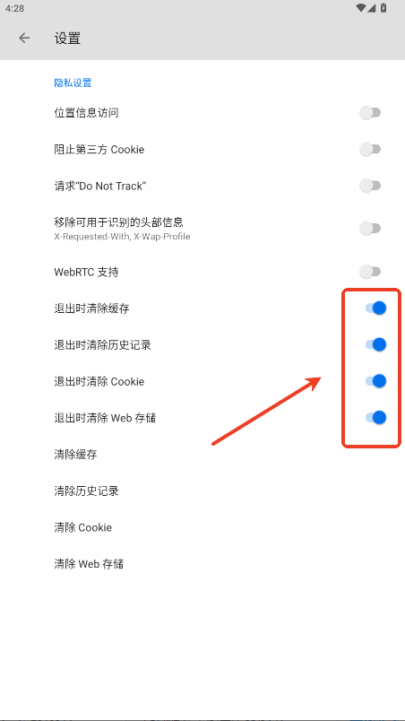 3.把退出時清除所有記錄按鍵全部打開即可。