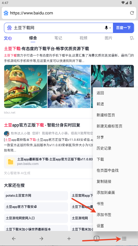 6.點擊添加書簽按鈕可以快速保存常用的網(wǎng)頁,下次訪問時更方便。