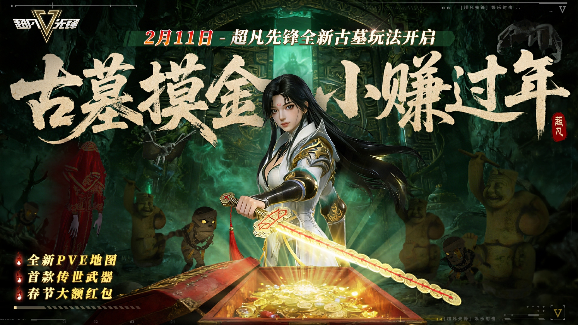 新春探險,正式啟程!《超凡先鋒》全新PVE玩法“古墓摸金”將于2月11日正式上線!深入千年幽墓,搜尋珍稀寶藏,體驗驚心動魄的探秘之旅——這個新年,帶你摸金致富!